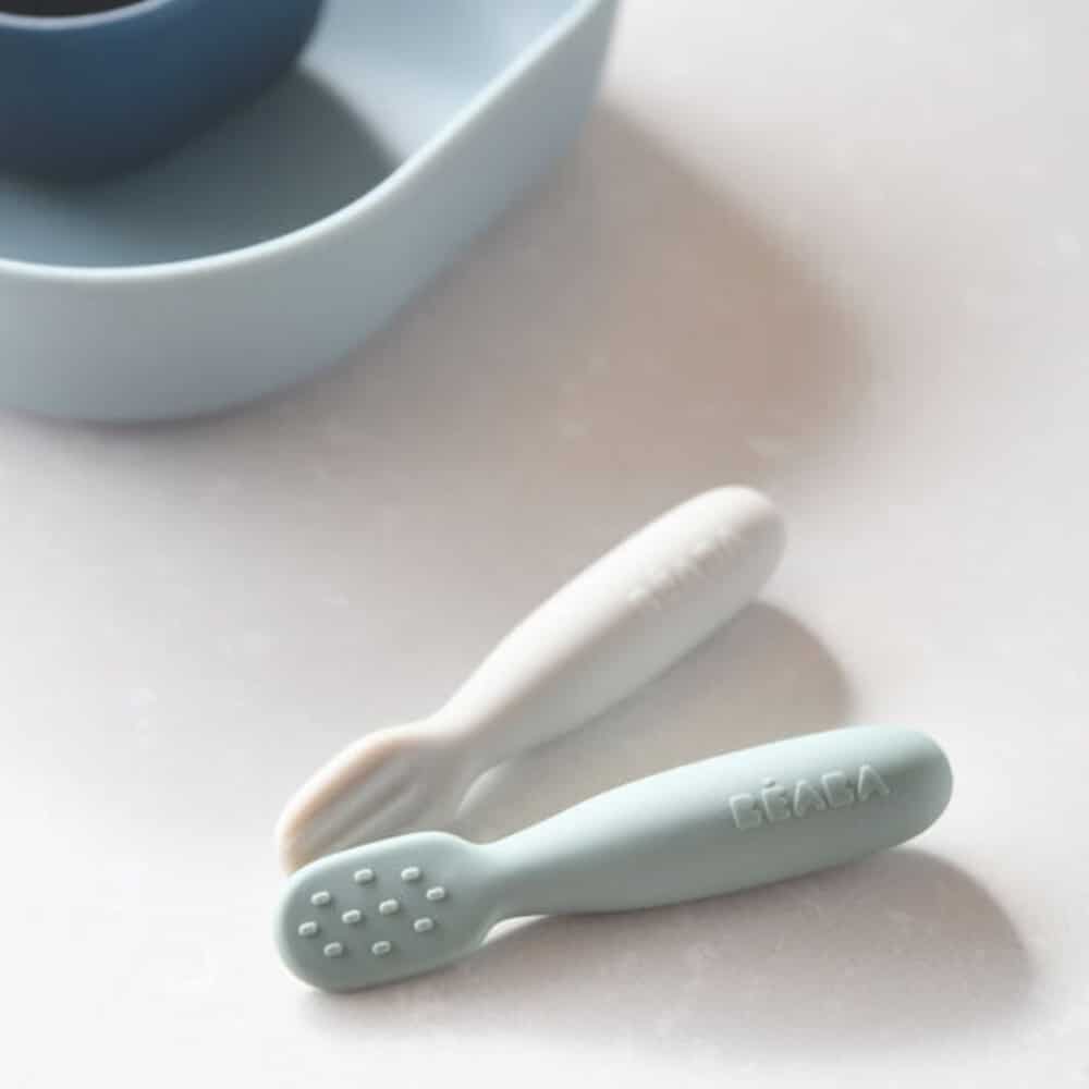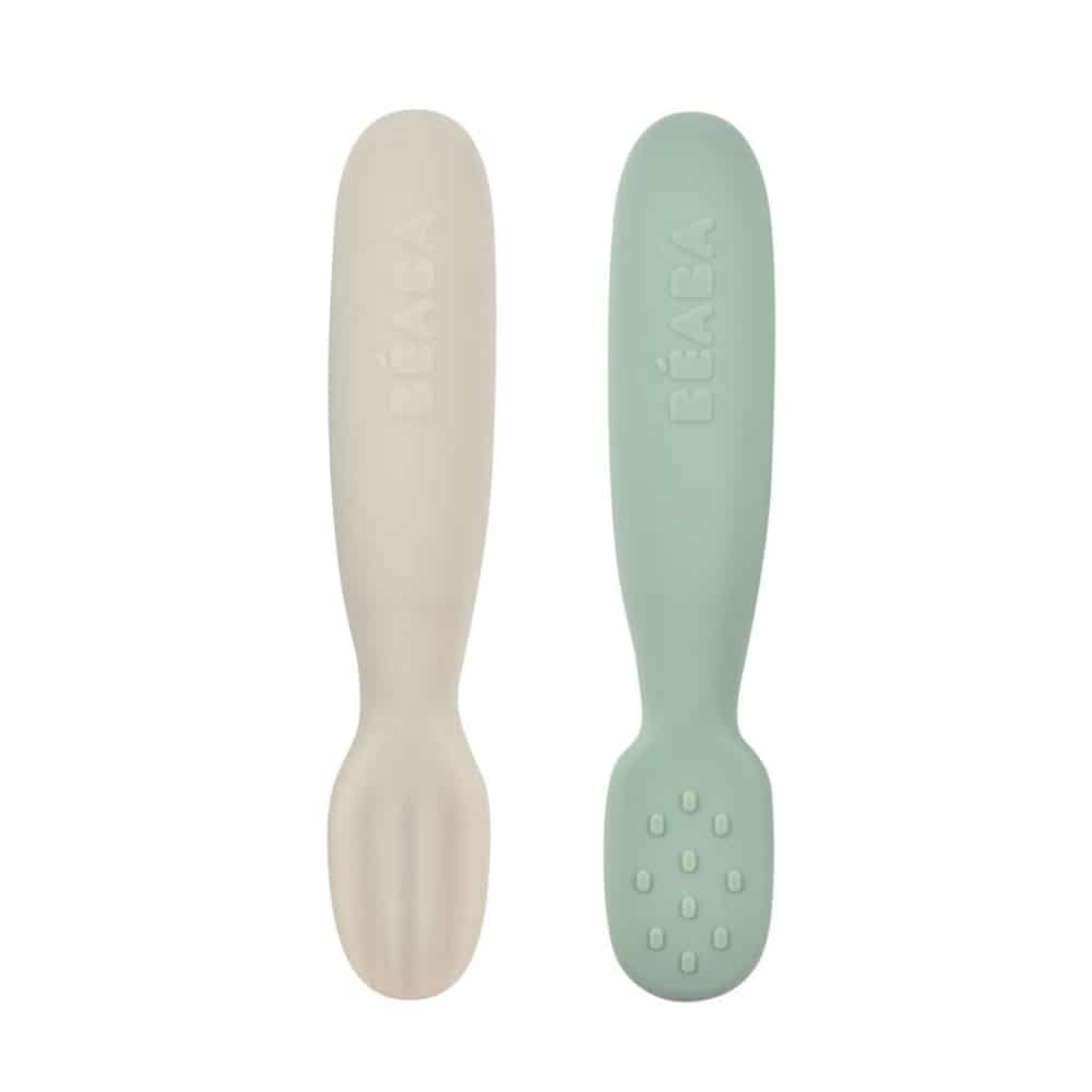 Lot de 2 Pré-cuillères d’Apprentissage Silicone Béaba – Vert Sauge / Gris Velours